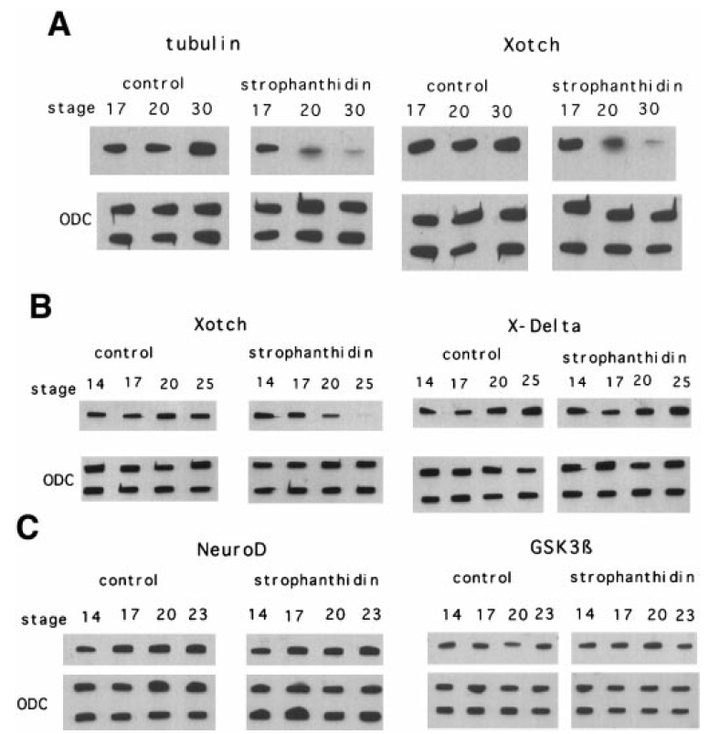 FIG. 6. Inhibiting the Na pump suppresses the expression of Xotch but not X-Delta. In all cases the Na pump was blocked with strophanthidin