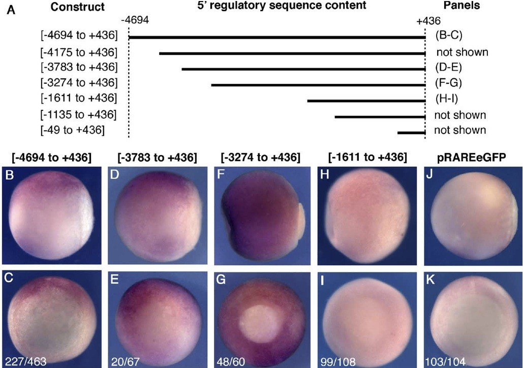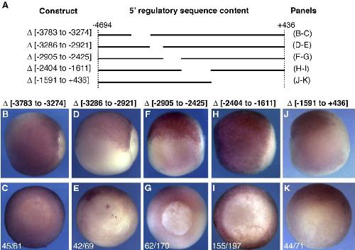 Fig. 3. Internal deletion series confirms the necessity of two 5V regulatory domains. Transgenic embryos carrying the constructs schematized in A were analyzed by in situ hybridization at st. 11.5 for the pattern of reporter expression. (B, D, F, H, J) Side views with posterior to the right and dorsal up. (C, E, G, I, K) Posterior views with dorsal up. (B, J, K) In situ for eGFP. (H, I) In situ for firefly luciferase. (C, E, G, I, K) Numbers represent the fraction of total embryos carrying the indicated construct that displayed the expression pattern shown. |