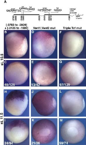 Fig. 5. Mutation of putative Tcf- and Vent-binding sites in the geminin 5V regulatory region alters reporter expression pattern in transgenic gastrulae. Using the construct schematized in A, consensus binding sites for Vent and Tcf at the positions shown were mutated (see Materials and methods). Sites are numbered relative to the transcription start site. (B M) Transgenic embryos carrying the non-mutated or mutated constructs were analyzed at early (st. 10.5; B G) and mid-gastrulation (st. 11.5; H M) by in situ hybridization for eGFP expression. (B, C, H, I) Construct with non-mutated sites. (D, E, J, K) Construct with mutated XVent1 and XVent2 sites. (F, G, L, M) Construct with all three Tcf sites mutated. (B, D, F, H, J, L) Side views with posterior to right and dorsal up. (C, E, G, I, K, M) Posterior views with dorsal up. (C, E, G, I, K, M) Numbers represent the fraction of total embryos carrying the indicated construct that displayed the expression pattern shown. |