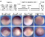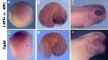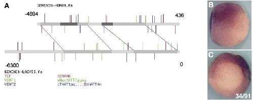 Fig. 7. Conservation of Regulatory Domains. (A) The 5.1 kb of hgem 5V sequence is aligned to 6300 bp of Xgem 5V sequence using WU-BLAST (http:// blast.wustl.edu) (parameters: W = 5, M = 5, N = 3, Q = 10, R = 10). Sequences are represented by gray bars. In hgem, the two regulatory domains are represented by dark gray bars. Aligned sequences between hgem and Xgem are represented by medium-gray bars and linked by green lines marking the ends of the alignments. Putative binding sites for Tcf, XVent1 and XVent2 are labeled by red, green and blue vertical lines, respectively. These putative sites are determined by scanning both sequences against scoring matrices of these transcription factors using the program PATSER (http://ural.wustl.edu) and using cutoff values determined by the program. Locations of lines (above or below the sequences) indicate the orientation of the sites (on forward or reverse strand respectively). Lengths of lines are proportional to the scores of the sites which indicate the strength of the sites. (B, C) Transgenic embryos carrying 5 kb of upstream sequence from Xgem cloned into pRAREeGFP were analyzed at st 11.5 by in situ hybridization for eGFP. (B) side view with posterior to the right and dorsal up. (C) posterior view with dorsal up. Numbers indicate sequence location relative to the transcription start site. |