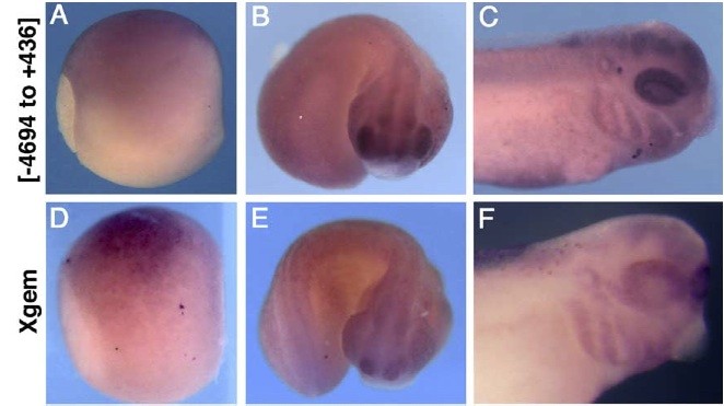 Fig. 1. Embryos transgenic for [-4694 to +436] express eGFP in a pattern that recapitulates endogenous geminin expression. Embryos were analyzed by in situ hybridization for eGFP (A C) or Xgem (D F) at st. 11.5 (A, D), st. 23 (B, E) and st. 35 (C, F). (A, D) Lateral views, dorsal up and anterior facing right. (B, C, E, F) Lateral views, dorsal up. (B, E) Embryos are curved with anterior structures facing out. |