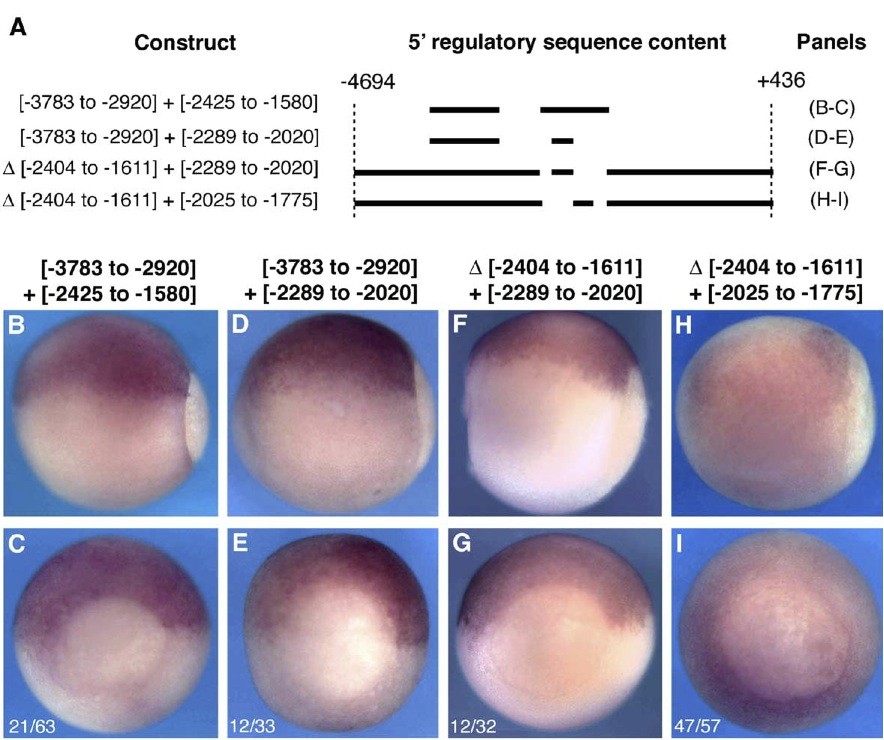 Fig. 4. Sufficiency of sequence domains to drive or restore dorsal-specific expression. Transgenic embryos carrying the constructs schematized in A were analyzed by in situ hybridization at st. 11.5 for the pattern of reporter expression. [-3783 to -2920] + [-2425 to -1580] and [-3783 to -2920] + [-2289 to -2020] were subcloned into pRAREsCMV. D[-2404 to -1611] + [-2289 to ô´2020] and D[-2404 to -1611] + [-2025 to -1775] were subcloned into pGL3basic. (B, D, F, H) Side views with posterior to the right and dorsal up. (C, E, G, I) Posterior views with dorsal up. (BâE) In situ for eGFP. (FâI) In situ for firefly luciferase. (C, E, G, I) Numbers represent the fraction of total embryos carrying the indicated construct that displayed the expression pattern shown. |