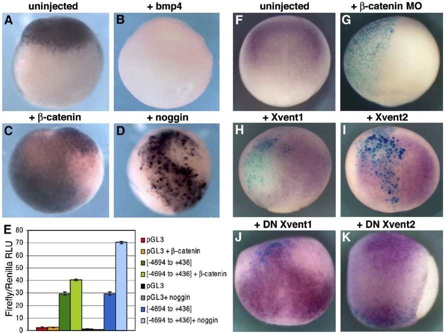 Fig. 6. geminin regulatory sequences respond to the Wnt and BMP signaling pathways in the gastrula embryo. (A D) In situ hybridization for eGFP in embryos transgenic for [-4694 to +436] plasmid. Animal hemisphere views of late gastrula embryos (st. 12), dorsal up. Embryos were injected in one cell at the two cell stage (left bilateral half in the images shown) with bmp4 (B), beta-catenin (C), or noggin (D) mRNA. (A) shows an uninjected sibling embryo. (E) Luciferase assays of embryos injected with pGL3basic or this vector containing 5.1 kb of geminin 5V regulatory sequences. Samples were co-injected with mRNAs as indicated. Normalized values (Firefly to Renilla) for three pools of embryos per sample were averaged. Representative results are shown. Error bars represent standard errors. (F) In situ hybridization for Xgem at st. 11.5. (F) Dorsal views with posterior down. (K) Side view with posterior to the right and dorsal up. (F) uninjected embryo (G) Injected with beta-catenin morpholino oligonucleotide into 1 cell at the 2-cell stage. (H K) Injected with mRNA for Xvent1 (H), Xvent2 (I), VPXvent-1 (J), or VPXvent-2 (K) into one A-tier blastomere at the 32-cell stage. (G K) Blue X-gal staining indicates site of injection. (B D and G) mRNA delivery was not restricted to a small ectodermal domain, and axial patterning of the injected embryos was broadly affected. |