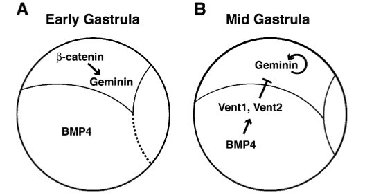 Fig. 8. Model of regulation of early geminin expression. (A) Early gastrula:. Nuclear-localized Beta-catenin is active dorsally. Our data demonstrates that Beta-catenin can activate Xgem and the geminin 5V sequences and that Tcf sites in the geminin regulatory sequences are necessary for geminin expression in dorsal ectoderm at early gastrulation. (B) Mid gastrula: geminin can activate its own transcription. BMP4 activates the transcriptional repressors XVent1 and XVent2. Our data demonstrates that XVent1 and XVent2 sites in the geminin regulatory sequences are necessary to restrict geminin expression to dorsal tissues at mid-gastrulation. We also found that Xgem or geminin regulatory sequences responded negatively to BMP signaling. Schematics are side views of st. 10.5 (A) and st. 11.5 (B) Xenopus gastrulae with posterior facing right and dorsal up. |