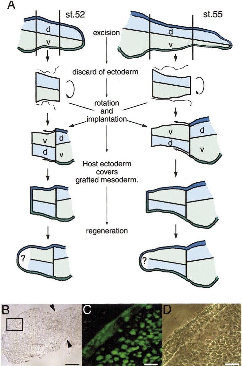 The results of recent studies have supported the idea that the ability to organize the formation of axes such as the anteroposterior and proximodistal axes corresponds to limb regeneration ability in Xenopus. In this study, we investigated the mechanism by which the dorsoventral (D-V) axis of regenerating Xenopus limbs is established and the relationships between D-V patterning and regenerative ability. Transplantation experiments were performed to study which epidermis or mesenchyme is responsible for the D-V patterning in regenerating limbs. Naked mesenchyme of a donor limb was rotated and implanted on a host opposite-side limb stump to make a reversed recombination about the D-V axis. The resultant regenerates had a normal-looking D-V pattern, including Lmx-1 expression, muscle pattern, and joints, in stage 52 recombinants and a reversed D-V pattern in stage 55 recombinants. Further experiments in recombination at stage 52 and stage 55 showed that the epidermal signal is responsible for producing the D-V pattern in the regenerating blastema. These results, together with the finding that Lmx-1 expression is absent in the froglet forelimb blastema, suggest that D-V axis formation is a key step in understanding the loss of regenerative ability.