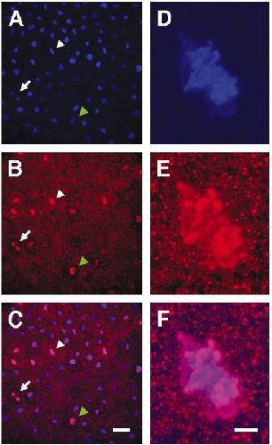 FIG. 1. Immunofluorescence microscopy of a Xenopus embryo stained with anti-phosphohistone H3 antibody (aPH3) at stage 9. The embryo was double-stained with the DNA dye DAPI (A and D, blue) and aPH3 (B and E, red) and observed with confocal microscopy. Merged images are shown in (C and F). (A C) Images at low magnification and (D F) at high magnification. Arrows in (A C) indicate a cell in anaphase, white arrowheads a cell in metaphase, and green arrowhead a cell in prophase/prometaphase. In (D F), individual condensed chromosome arms are clearly seen. Scale bar 5 50 mm (A C), or 5 5 mm (D F).