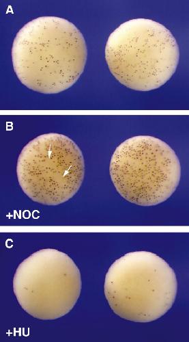 FIG. 2. Whole-mount immunostaining by aPH3 after treatment with nocodazole (NOC) and hydroxyurea (HU). Animal pole views of (A) control, (B) NOC-treated, and (C) HU-treated embryos at stage 9. Dark brown dots are aPH3-positive nuclei. A small population of cells in NOC-treated embryos was not stained by aPH3 antibody (2B, arrows), presumably because these cells had just completed the previous mitosis at the start of nocodazole application and had a cell-cycle period longer than the duration of the treatment (2 h).