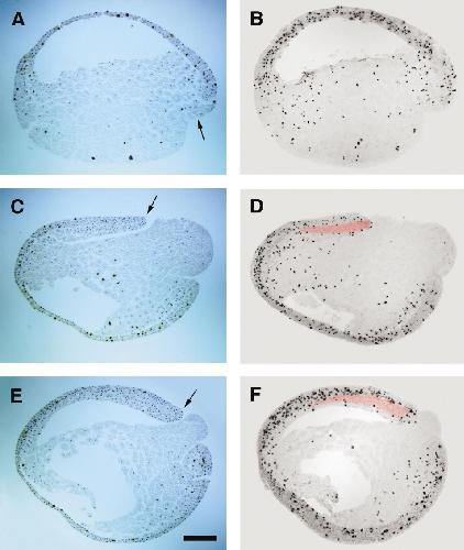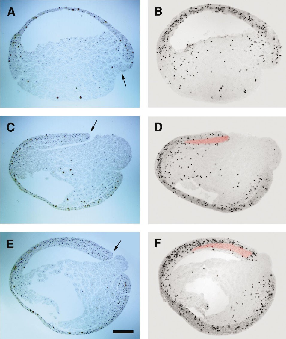 FIG. 4. Cell divisions detected by aPH3 in gastrula stage embryos. (A, C, and E) Sagittal sections of aPH3-stained embryos at stage 10.5, 11, and 12, respectively. Brown dots are mitotic nuclei and blue dots are nonmitotic nuclei. Arrows indicate dorsal lip. Scale bar is 200 mm.