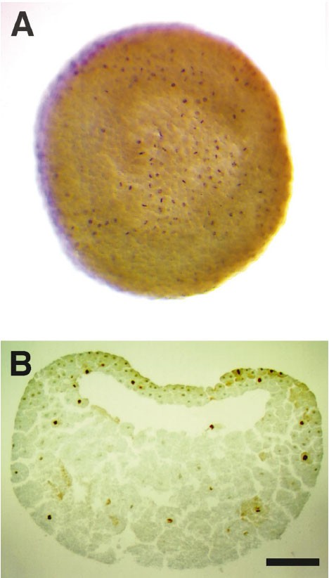 FIG. 3. Xenopus cell division pattern at stage 9. (A) Animal pole view of a whole embryo stained with aPH3 after clearing. Brown dots are mitotic nuclei. (B) Midtransverse section of a stained embryo. Mitotic nuclei appear as brown dots and other nuclei are light green.
