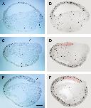 (B, D, and F) Composite images of 11 serial sagittal sections of a representative embryo at stages 10.5, 11, and 12, respectively. Mitotic nuclei appear as black dots. Dorsal axial mesoderm is highlighted in red; mitotic cells are absent. Note that due to distortion during