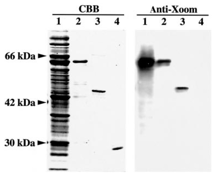 antibodies (anti-Xoom). Isolated Xoom protein band shows a size