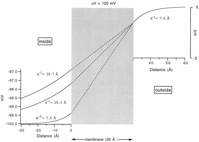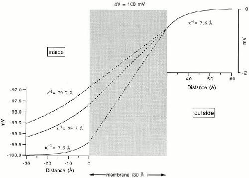 Figure 1. Analytical solution of the linearized Poisson-Boltzmann equation for a planar membrane of 30 Å thickness. The ionic strength in the outside solution is fixed at 318 mM (κ−1 = 7.6 Å) and, in the intracellular side, it is reduced from 318 to 24 mM (κ−1 = 29.1 Å) and 12 mM (κ−1 = 39.7 Å). The imposed membrane potential is −100 mV. The fraction of membrane potential that decays in the intracellular bath is 0.75, 2.1, and 2.8% of the total potential, respectively. The potential decays exponentially on the internal and external side of the membrane and linearly in the membrane region. Note the different scales used to represent the potential in the solutions and in the membrane. |