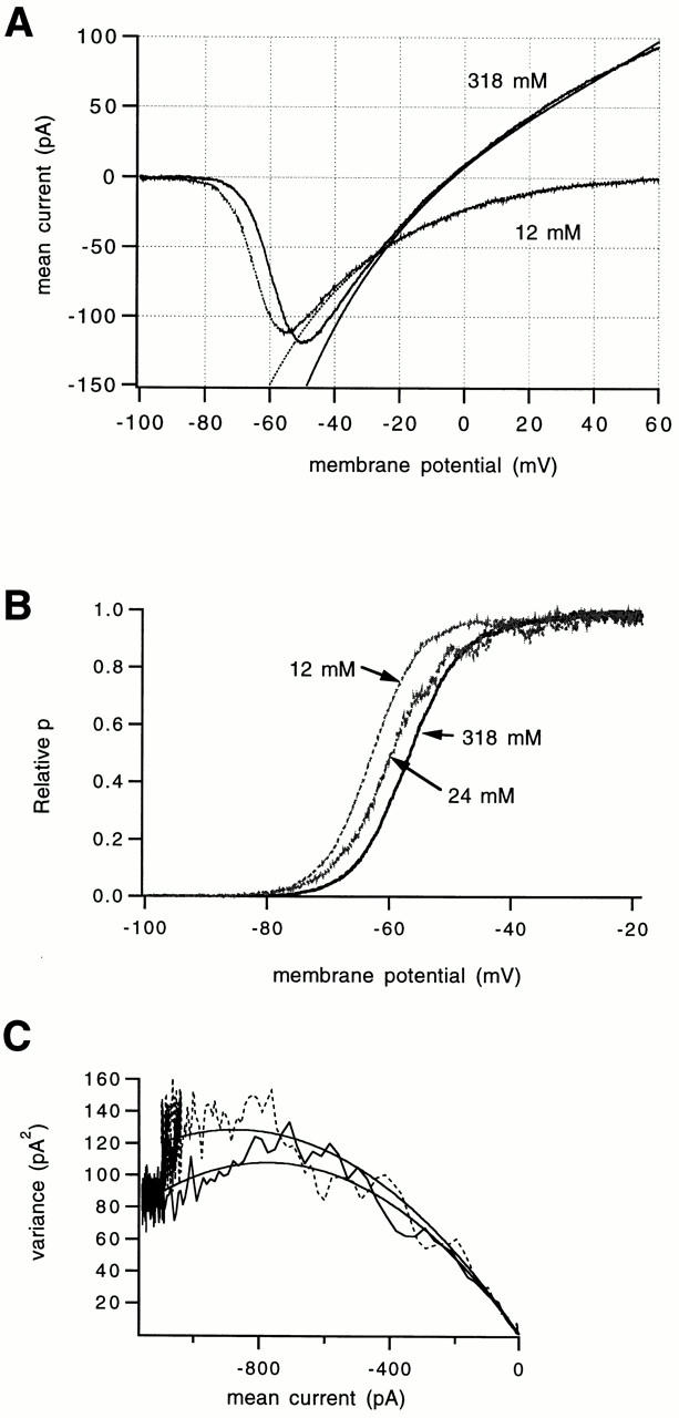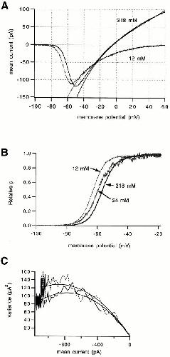 Figure 4. Ionic strength effects on ionic currents of Shaker. (A) I(V) relationships obtained from ramps of voltage (0.32 mV/ms) using S = 318 K-Asp intracellular K+ solution and switching to S = 12 mM intracellular solution. The external solution is pipet K. The continuous curves superimposed in the I(V) curves are fits to a open channel I(V) curve derived from a single barrier permeation model according to IV=GaKie−1−δzeoVkT−KoeδzeoVkT, where [K]o and [K]i are the extracellular and intracellular potassium concentrations, respectively, δ is the electrical distance, and z is the valence; eo, k, and T have their usual meanings. Ga has units of nanoamperes per millimolar. The values used in the fit are for S = 318 mM, δ = 0.7, and Ga = 0.37 nA/mM. For S = 12 mM, δ = 0.7 and Ga= 0.23 nA/mM. The value of z remained constant at unity. (B) The relative open probability as a function of voltage at three different ionic strengths. The continuous traces are obtained from the ramps in A by dividing by the open channel I(V) function. Boltzmann fits show that the lowest ionic strength solution (12 mM) produces a 10-mV shift in the hyperpolarizing direction. The shift at 24 mM is 6 mV. (C) Nonstationary noise analysis of currents at −20 mV recorded at 8 kHz bandwidth. The effect of the lower ionic strength is to increase the single channel conductance by a small factor that accounts for the increased variance, while the change in the open probability and the number of channels is also small. The estimated values from a fitted parabola (continuous curves) are as follows: at 318 mM, i = −0.24, pA, N = 5,624, and pmax= 0.81. At 12 mM, i = −0.3 pA, N = 5,605, and pmax = 0.67. |