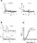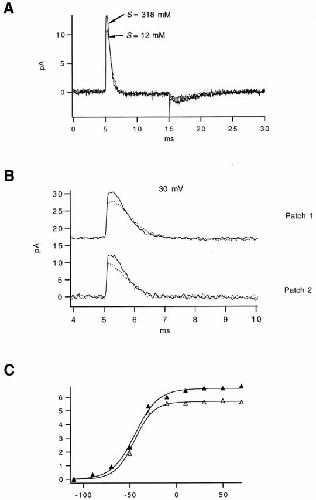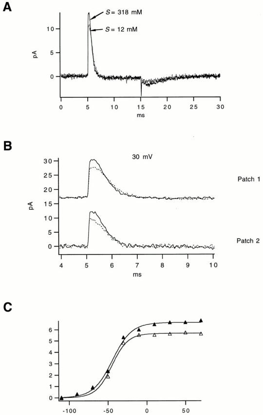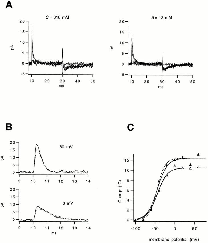 Figure 5. Effects of mannitol-containing low ionic strength solutions (12 mM) on the gating charge movement in Shaker. (A) Gating current traces before and after perfusion of the intracellular side of a patch for depolarizations from –90 to 30 mV. (Continuous trace) 318 mM(CsCl); and (dotted trace) 12 mM CsCl, with mannitol substituted for sucrose. (B) Two different patches at 30 mV in control solution (continuous line) and after (dotted line) perfusion with the S = 12 mM mannitol solution in an expanded time scale. (C) The full Q(V) relationship for the top patch in B. Open triangles are the charge in S = 12 mM, and closed triangles are the control in S = 318 mM. A reduction of 14.5% in the charge is apparent from this patch. The continuous curves are fits to a Boltzmann function. The parameters of the fit are as follows: at 12 mM, Qmax= 5.7 fC, V0.5= −45.1 mV, and qg= 2.4 eo. At 318 mM, Qmax= 6.6 fC, V0.5= −44.3 mV, and qg= 2.0 eo. |
