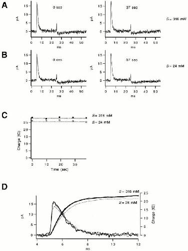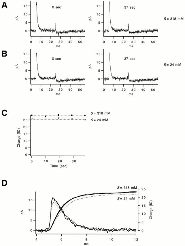 Figure 6. Tests for possible charge immobilization produced by slow inactivation of Shaker channels. (A and B) Representative average gating currents obtained from 10 sweeps for depolarization from –90 to 0 mV. The pulse interval was 200 ms for averaging, and an average was acquired every 9 s. The high S solution in A was intracellular control NMDG and the low S solution in B was intracellular 24 (Table ). (C) The ON gating charge plotted as a function of time for the patch in A and B. The total observation time was 37 s in each solution. The charge in either solution remains constant for the duration of the patch life, indicating that at least in this period there is no detectable charge immobilization. (D) Reversibility of the S effect. Gating current and its time integral are shown from a different patch. The thick trace is the control; the dotted trace is the gating current or charge in the low S solution (24 mM); and the thin trace is the gating current or charge after return to the high S solution 4.5 min later. In this particular experiment, the charge recovers to 98% of the control. |