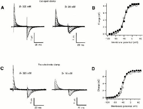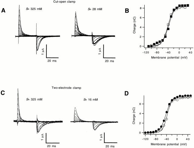 Figure 7. Extracellular effect of low ionic strength solutions on charge movement. (A) Gating current traces from the cut-open oocyte clamp in extracellular control solution S = 325 mM are on the left. The right panel shows currents at S = 28 mM. (B) The corresponding Q(V) relationships. The parameters of the fitted Boltzmann function (continuous curves) are at S = 28 mM, Qmax= 8.7 nC, V0.5= −38.6 mV, and qg= 2.3 eo. At S = 325 mM, Qmax= 8.3 nC, V0.5= −41.8 mV, and qg= 2.5 eo. The maximum charge is reduced 4.2%. Closed symbols represent the control charge, and open symbols are the charge in low ionic strength. (C) Gating currents from a different oocyte recorded using the two-microelectrode voltage clamp. The low ionic strength solution is extracellular 16 mM. (D) Q(V) relationships of the experiment in C. Open circles correspond to the charge in low ionic strength. The following are parameters of the fitted Boltzmann function at S = 16 mM: Qmax= 7.7 nC, V0.5= −38.2 mV, and qg= 2.9 eo. At S = 325 mM: Qmax= 7.7 nC, V0.5= −42.5 mV, qg= 2.2 eo. The charge is reduced by 5.2% in the S = 16 mM solution. |