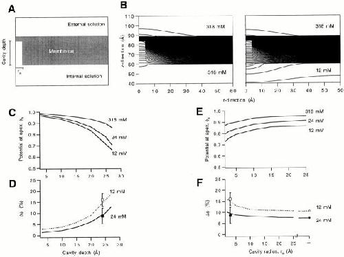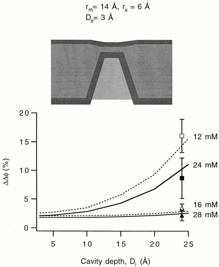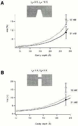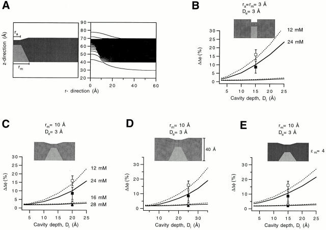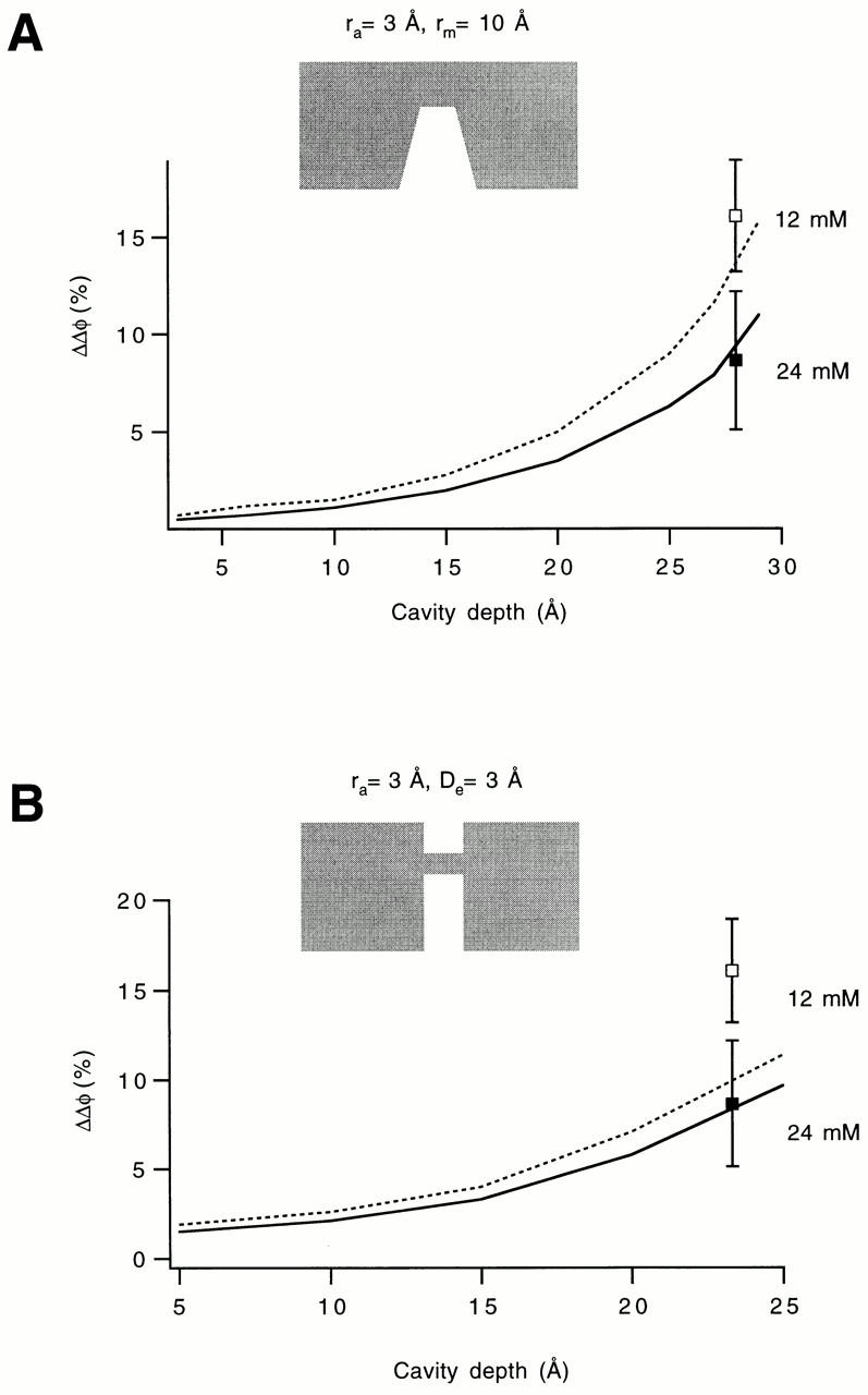 Figure 10. Numerical solutions of the linearized Poisson-Boltzmann equation for two different geometries. (A) Truncated conical cavity. The membrane thickness was 30 Å, and the cone radii were fixed at ra = 3 Å and rm = 10 Å as the cavity depth was varied. The top diagram is a schematic representation of the geometry. The potential difference in the short slab of membrane was calculated as Δfm = φa − fe, where φa is the potential at the apex of the internal cavity and φe is the potential at the external surface of the membrane axially opposite to φa. The effect of changing S was calculated as ΔΔf = Δfm(318) − Δfm(S). (B) Double cylindrical cavity. The radii ra = rm of both cavities were 3 Å, and the depth of the external cavity was De = 3 Å. The extracellular side and cavity have a constant high ionic strength of 318 mM. The reduction of potential ΔΔf was calculated (as in A) as a function of depth of the internal cavity. The calculation was done at depths 5, 10, 15, 20, and 25 Å. The symbols correspond to the experimental reductions plotted at 23 Å. |