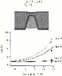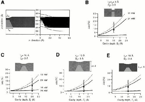 Figure 11. Calculated effects of S in the double cavity system with low dielectric constant (É = 30) in the internal cavity. (A) The radius ra is the same for the external and internal cavity, and the mouth radius rm was varied. The geometry of the system is shown in each panel. The internal cavity depth is Di, and the external cavity depth is De. (B) Variation of the potential difference as a function of Diin the double cylinder. The internal cavity has É = 30. The function ÎÎf is calculated as ÎÎf = [Ïa(318) â Ïe(318)] â [Ïa(S) â Ïe(S)], where Ïa is the potential at the apex of the internal cavity and Ïe is the potential at the base of the external cavity. Traces are ÎÎf as a function of Di at S = 24 mM (continuous curve) and S = 12 mM (dotted curve). Open squares are the observed charge reduction for a change in internal S to 12 mM; and closed squares are the reduction in charge for a reduction of internal S to 24 mM. (C) Similar calculation as in B but using a truncated-cone double-cavity system with the dimensions indicated and ra = 3 Ã . The upper traces are values of ÎÎf as a function of Di for internal changes of S. The continuous trace is the change in potential for a change of S to 24 mM; and the dotted curve is the change of potential for a change of S from 318 to 12 mM. The data points correspond to the experimental reductions of charge at the indicated value of S plotted at a depth value of 20 Ã . The traces at the bottom of the panel are the potential changes ÎÎf induced by reducing the external value of S from 318 mM to 28 and 16 mM, while keeping internal S constant at 318 mM. In each case, the external cavity had a depth De = 3 Ã . The triangles are the experimentally measured reductions of charge for extracellular reductions of S, which are indicated. (D) The thickness of the membrane has been increased to 40 Ã . The calculation was performed as in C with ra = 3 Ã and the parameters indicated on each cartoon. The cavity was assigned a dielectric constant of 30, and the bulk extracellular and intracellular solutions had a value of 80. The depth of the membrane Di was changed to the indicated values. The ÎÎf values plotted are the potential difference across the septum for changes of S from 318 to 24 mM (continuous line) or to 12 mM (dotted line). The external cavity was fixed at 3-Ã depth. The values in the bottom of the panel correspond to the calculation for the extracellular effects of S for changes from 318 to 28 mM (continuous) or 16 mM (dotted), while keeping the internal value of S constant at 318 mM. The experimental reductions of charge as a function of S were plotted at a cavity depth of 25 Ã . (E) Effect of increasing the dielectric constant of the channel-membrane system to 4. The thickness of the membrane was 30 Ã . The dielectric constant of the cavity and bulk solutions were 30 and 80, respectively. Note that this configuration poorly predicts the observed experimental effects of S, although the effects of reducing S are qualitatively similar to those obtained with É = 2. The best fit cavity becomes smaller with É = 4 than with an É = 2. |