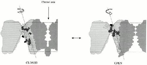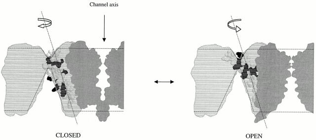 Figure 13. Cartoon of the possible geometry of the gating pore and voltage sensor. The S4 helix is represented by the structure proposed in the model of Durell et al. 1998 as a space-filling α-helix, the charged residues are in black. The lightly shaded area represents the bulk of the channel's voltage-sensing domain, and the darker area is the pore domain (modeled after the KcsA crystal structure). The dotted lines represent an outline of the cavity around S4 that have been idealized in the electrostatic calculation. (Left) Closed conformation; (right) open conformation. It is assumed that the main conformational change is a rotation of the S4 α-helix around its axis. Upon depolarization, a small portion of the voltage sensor moves, changing the accessibility of the NH2-terminal charged residues that are more external. This movement of charged residues across the narrow area of focused membrane potential produces the gating currents. |