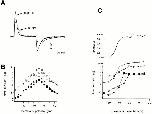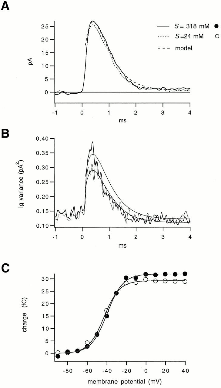 Figure 2. Effects of low ionic strength solution (24 mM) on the gating charge movement in Shaker. (A) Gating current traces at +20 mV from a holding potential of –90 mV, before (continuous trace) and after (dotted trace) perfusion on the intracellular side of a patch. The dashed curve is the gating current predicted by the model, corresponding to the high S current. (B) The variance of the gating current at +20 mV calculated from fluctuation analysis of the gating current. The continuous trace is the variance in the control solution, and the dotted trace is the variance in the low ionic strength solution. A reduction of 10% in the charge predicts a reduction of 20% in the gating charge variance. The light curves superimposed in the variance are the prediction according to . The gating current was calculated according to the simple irreversible scheme:SCHEME 1.with α = 2,380 s−1, q1/q2= 0.011eo, and β = 2440 s−1 for the high ionic strength; and α = 2,500 s−1, q1/q2= 0.005, and β = 2390 s−1 for low ionic strength. (C) The Q(V) relationship for the patch in A. Open symbols are the charge in low ionic strength (24 mM) and closed symbols are the control (318 mM). Continuous curves are fits to the Boltzmann activation function (see materials and methods). The following are parameters of the fit for 24 mM: Qmax= 29.3 fC, V0.5= −42.6 mV, and qg= 3.1 eo. For 318 mM: Qmax= 31.9 fC, V0.5= −39.6 mV, and qg= 3.0 eo. |