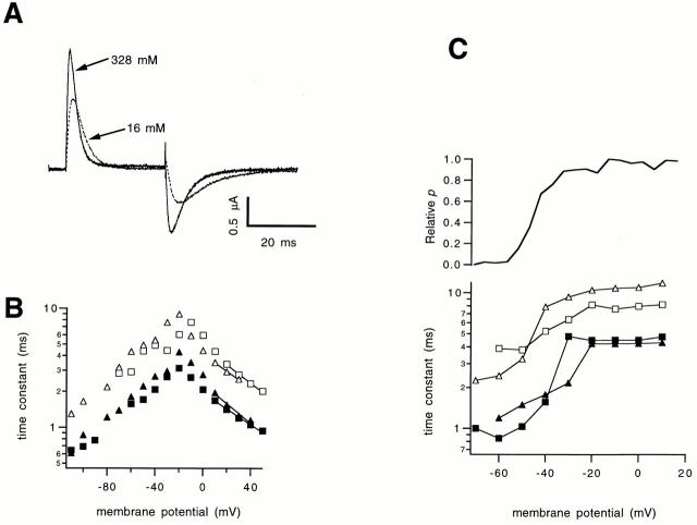 Figure 8. Comparison of gating current kinetics at high and low extracellular ionic strength. (A) Gating currents at 0 mV obtained with the cut-open voltage clamp. The faster trace was obtained at S = 325 mM and the slower trace corresponds to S = 16 mM. It is evident that both the ON and OFF kinetics are slowed down. (B) Comparison of the time constants of current decay, τon. ON gating currents were fitted to a single exponential function, and the time constant was plotted as a function of voltage. Open symbols are the data points at low ionic strength (S = 16 mM). Closed symbols are the data at high ionic strength (S = 325 mM). Squares correspond to data obtained with the two-microelectrode voltage clamp, and triangles correspond to cut-open voltage clamp. Solid lines correspond to fits of the most depolarized points to the function: τon(V) = τon(0) · exp(−qonV/kT). The values of qon are as follows: (open triangles) 0.41 eo; (open squares) 0.44 eo; (closed triangles) 0.47 eo; and (closed squares) 0.37 eo. (C) Time constant of decay τOFF(V) for OFF gating currents. A single exponential was fitted to the decay phase of the current and is plotted as a function of the potential during the activation pulse. The upper panel in the figure is the relative open probability p(V) as a function of voltage, obtained from conducting channels (ShΔ) recorded from a cell-attached patch in low external K+ solution with high S (295 mM). Note that the function τOFF(V) has a similar voltage dependence to p(V). |