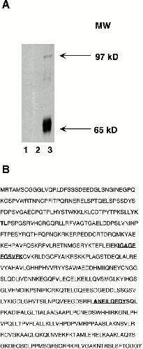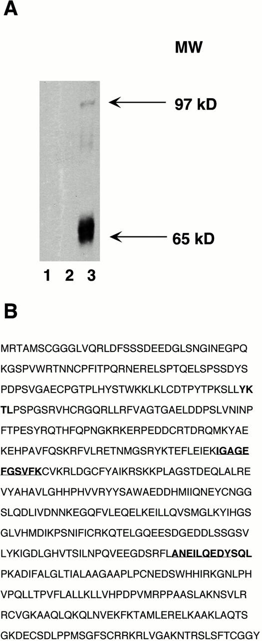 Figure 1. Purification of Crk SH2 binding proteins. (A) Crk SH2 binding proteins were isolated as described in Materials and Methods, resolved using SDS-PAGE, and processed for Western blot analysis using an antiphosphotyrosine antibody. Lane 1, GST beads plus extract; lane 2, GST–SH2 beads plus ELB; lane 3, GST–SH2 beads plus extract. (B) Microsequencing analysis identified Wee1 as the specific 68-kD major Crk SH2 binding protein. Mass spectrometric analysis yielded two peptides that match exactly the sequence of the XWee1 protein. The first peptide, IGAGEFGSVFK, corresponds to amino acids 216–226 in the Wee1 protein sequence, and the second peptide obtained from microsequencing, ANEILQEDY, matches amino acids 395–403 (bold and underlined). Putative Crk SH2 binding consensus sequences (YKTL, amino acids 110–113; YSQL, amino acids 403–406) are indicated by bold text. |