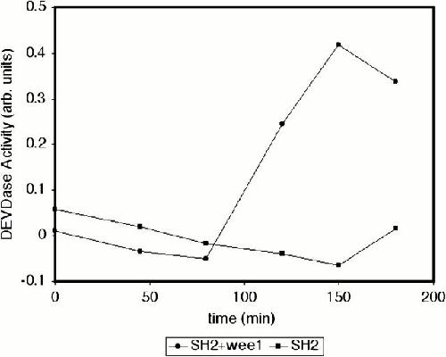 Figure 7. Wee1 restores apoptotic activity to Crk SH2–depleted extracts. GST–Crk SH2 domain bound to glutathione-Sepharose was used to deplete egg extracts (two times, 30 min, 4°C). Recombinant Wee1 (20 ng/μl, final concentration) or XB (control) was added to depleted extracts at a 1:10 dilution (vol/vol). The depleted extracts were also supplemented with energy-regenerating cocktail, incubated at room temperature. Samples were taken at the indicated times and subjected to a DEVDase assay. |