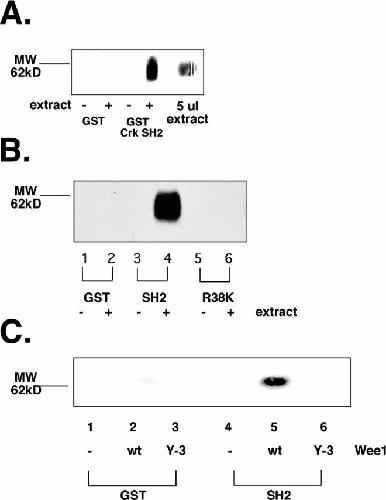 Figure 2. Wee1 binds to the Crk SH2 domain. (A) GST-fused Crk SH2 domain linked to glutathione-Sepharose was used to precipitate Crk SH2 binding proteins from egg extracts. GST bound to glutathione-Sepharose resin was used as a control for nonspecific protein binding. Bead-bound material was washed in ELB to remove nonspecific protein binding. Bound proteins were eluted in SDS-PAGE sample buffer and detected by Western blot with polyclonal anti-Wee1 antisera. (B) A mutant form of the Crk SH2 domain (R38K), which does not bind tyrosine phosphoryalted proteins, does not bind Wee1. Resins consisting of GST (lane 2), GST–SH2 (lane 4), or GST–-SH2R38K (lane 6) bound to glutathione-Sepharose were incubated with Xenopus egg extract. The bead-bound material was washed several times with ELB to remove nonspecific protein binding and then resolved by SDS-PAGE. Wee1 binding was detected by immunoblotting with an affinity-purified anti-XWee1 antibody. GST, GST–SH2, and GST–SH2R38K resins that were not incubated with extract (lanes 1, 3, and 5, respectively) were also resolved on this gel as negative controls. (C) Tyrosine phosphorylation of Wee1 is required for its interaction with Crk SH2 domain. Lysates were generated from baculovirus-infected Sf9 cells expressing either wild-type (wt) XWee1 or a mutant form of XWee1 in which three tyrosines (Y-3 Wee1; Y90, Y103, and Y110) were mutated to phenylalanine. These lysates were incubated with either GST (lanes 2 and 3) or GST–Crk SH2 domain (lanes 5 and 6) bound to glutathione-Sepharose. Bead-bound material was washed several times with ELB to remove nonspecific protein binding and subsequently resolved using SDS-PAGE. Western blot analysis, using an affinity-purified polyclonal anti-XWee1 antibody, was used to determine whether XWee1 (lanes 2 and 5) or Y-3 Wee1 (lanes 3 and 6) bound to either of the two resins. As negative controls, GST resin (lane 1) and GST–Crk SH2 resin (lane 4), which were not incubated with extract, were also resolved on this gel. |