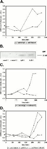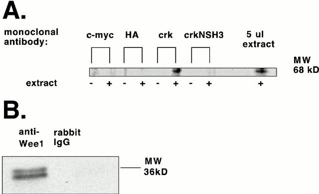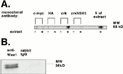 Figure 3. Endogenous Crk and Wee1 physically interact in egg extracts. (A) Anti–c-Myc, HA, or Crk monoclonal antibodies were bound to protein A–Sepharose and used to precipitate bound proteins from egg extract as described in Materials and Methods. Bead-bound material was washed in ELB to remove nonspecific protein binding, and then resuspended in SDS-sample buffer and processed for Western blotting using a polyclonal Wee1 antibody for detection. (B) Reciprocal immunoprecipitation was performed using a polyclonal Wee1 antibody or control IgG bound to protein A–Sepharose. Samples were processed for Western blotting using an anti-Crk monoclonal antibody for protein detection. |