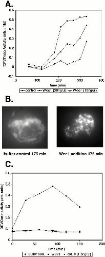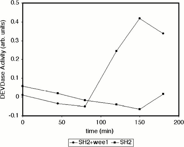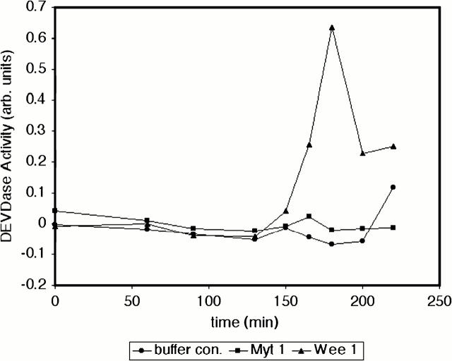 Figure 5. Wee1, but not Myt1, accelerates caspase activation in egg extracts. Recombinant GST–Myt1 and His-Wee1 were diluted into XB such that the amount of Cdc2-phosphorylating activity of each preparation was equal. These kinases, normalized for activity, were then added to egg extracts at a 1:10 dilution (vol/vol). These treated extracts were incubated at room temperature and subjected to a DEVDase assay with extract samples taken at the indicated times. |