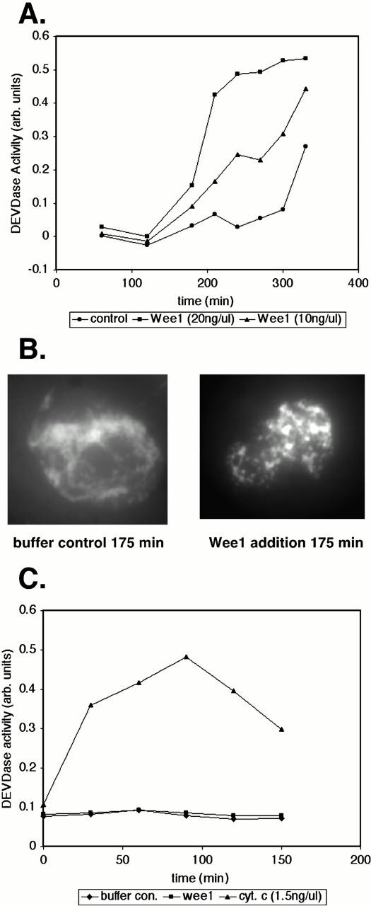 Figure 4. Addition of exogenous Wee1 accelerates apoptosis in egg extracts. (A) His-tagged XWee1 produced in baculovirus-infected Sf9 cells (20 or 10 ng/μl, final concentration) or XB was added to egg extracts. During a room temperature incubation, extract samples (3 μl) were taken at the indicated times and processed for DEVD-pNA cleavage activity. (B) His-tagged Wee1 (20 ng/μl, final concentration; right) or XB (buffer control; left) was added at 1:10 (vol/vol) to extracts supplemented with nuclei (∼2,000 nuclei/μl). Extract samples (2 μl) were taken at various time intervals, fixed with formaldehyde, and stained (chromatin) with Hoechst 33258. Fluorescence microscopy was used to visualize the nuclear morphological changes associated with apoptosis. (C) His-Wee1 (20 ng/μl, final concentration), purified cytochrome c (1.5 ng/μl, final concentration), or XB was added to purified cytosolic egg extracts lacking heavy membrane components, including mitochondria, at a 1:10 (vol/vol) dilution. During a room temperature incubation, extract samples were taken at the indicated times and processed for DEVD-pNA cleavage activity. |