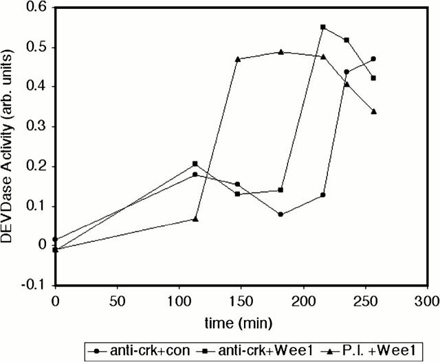 Figure 8. Wee1 signals on a Crk-mediated apoptotic pathway. Egg extracts were depleted with immune complexes formed from polyclonal anti-Crk antisera or preimmune sera bound to protein A–Sepharose (two consecutive depletions; 4°C, 30 min). Recombinant His-tagged Wee1 (10 ng/μl, final concentration) or XB (control) was added to the depleted extracts at a 1:10 dilution (vol/vol). Extracts were incubated at room temperature, and extract samples were taken at the indicated times in order to assay DEVD-pNA cleavage activity. |