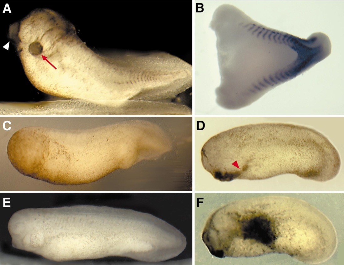 Fig 3. Secondary axis, anterior defect, and ectopic pigmentation. (A) 77E19 (ï°-catenin) induces a complete secondary axis. Ectopic cement gland marked with red arrow, normal cement gland marked with white arrowhead. (B) Clone 31N15 (Wnt-7b) also induces a complete secondary axis. This embryo has been stained with MyoD. (C) Embryo injected with clone 81C8A/81E10C (similar to KIAA0058) displays anterior defects. (D) Injection with 2H23 (Sox-2). This embryo shows ectopic pigmentation continuous with the cement gland (red arrowhead). (E) Uninjected control. (F) Embryo injected with 17J10 (Forkhead-2) shows ectopic pigmentation.