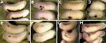 Fig. 4. Apoptosis, epithelial disruptions, and edema. (A) Unin- jected control, stage 10. (B) Embryo injected with clone 19N22 (vex-1) begins to show the mottled phenotype characteristic of apoptosis. (C) Embryo injected with 19K13 (similar to caspase-2) shows more severe apoptosis. (D) At later stages (here, st. 23), the dead cells are extruded into the vitelline space. Once the embryo hatches out, these cells will fall off and the embryo will look morphologically normal. This embryo was injected with 10A7b (similar to trip-7). (E) Embryos injected with 118B6A (similar to xepsin) show an epidermal defect. (F, G) Embryos injected with 101J13 (Rac-1) display ventral edema. (F) Stage 20. (G) Stage 28. Note that at later stages the fluid-filled sac has regressed.