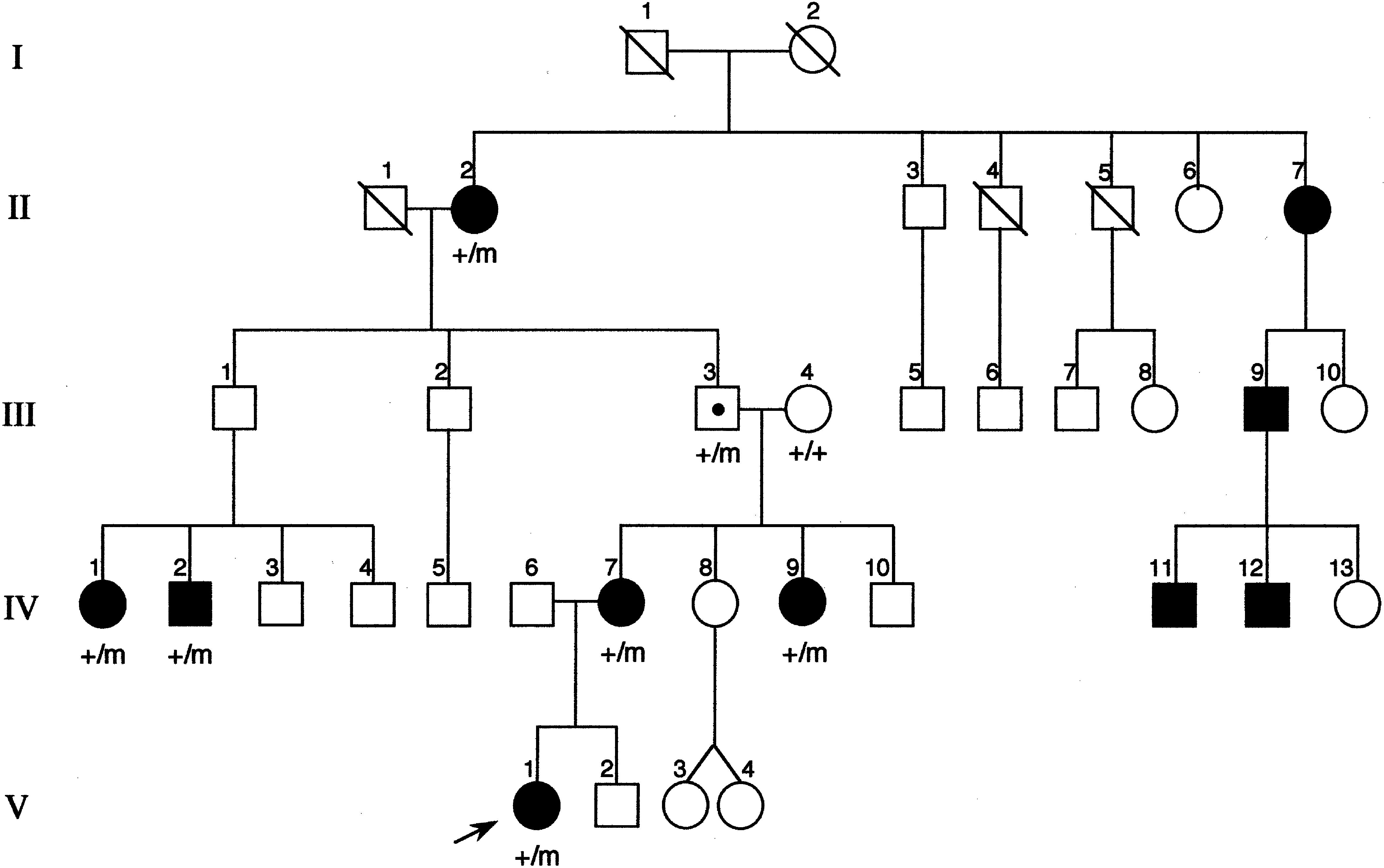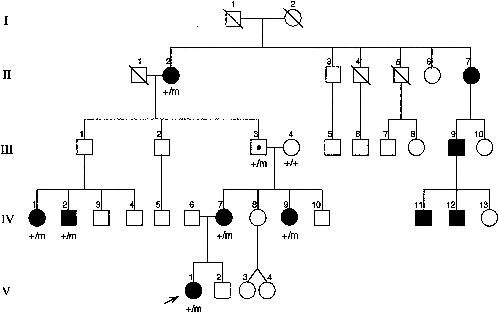 Figure 1. Scottish family, with family members carrying the mutated CHRNB2 codon287 indicated by “m”