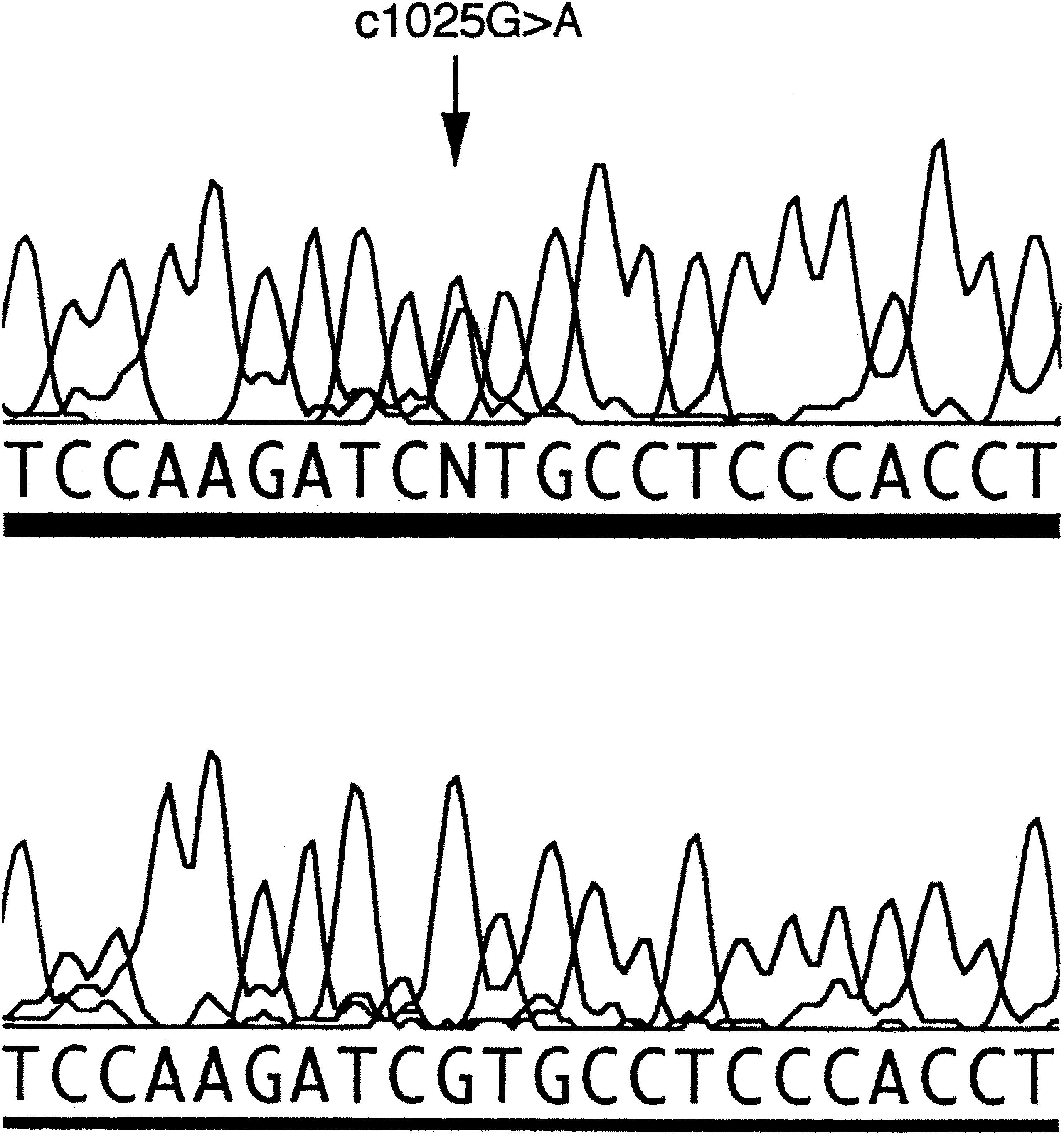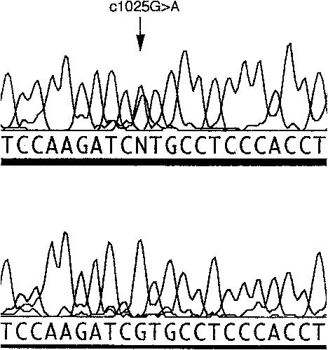 Figure 2. DNA sequence of CHRNB2, showing the c1025G→A transition. The upper chromatogram shows the mutation. The lower chromatogram shows the control sequence.