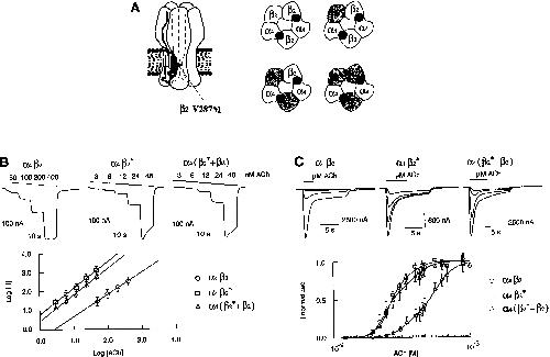 Figure 4. A, left panel, Neuronal α4β2 heteropentameric receptor resulting from the assembly of two α4 and three β2 subunits. Right panel, α4β2 is shown as a pentamer with two potential ACh-binding sites. “β2*” identifies the V287M amino acid substitution. The ACh receptor can assemble without any mutated β2 subunit (α4β2 wild-type receptor) or with one, two, or three mutated β2* subunits. B, upper panel, Current traces elicited by consecutive applications of four or five increasing ACh concentrations (horizontal bars). The values above each bar indicate the concentration of ACh applied to the cell. Lower panel, Differences in ACh affinity are emphasized in a log-log plot. The logarithm of the absolute value of the current (measured in the upper panel, Log [−I]) is plotted as a function of the logarithm of ACh concentrations (Log [ACh]). −I and [ACh] are expressed in nA and nM, respectively. Values are mean ± SEM, with n=9 (α4β2), n=17 (α4β2*), and n=10 (α4[β2*+β2]). Solid lines are the best linear regression throughout data points. C, upper panel, Representative macroscopic currents recorded in oocytes expressing either the wild-type or mutated β2 subunit. Currents evoked by four ACh concentrations (0.1, 0.2, 0.8 and 8 μM) are superimposed. Cells were held at −100 mV and challenged with ACh (10 s) once every 120 s. Bars indicate ACh applications. Lower panel, ACh activation curves for α4β2, α4β2* and α4(β2*+β2). Dose-response curves were normalized to the maximal current amplitude of each cell. Values are mean ± SEM. For each ACh concentration, 3–8 independent measurements were averaged. Values of the curve fits are given in the text.