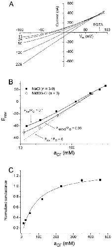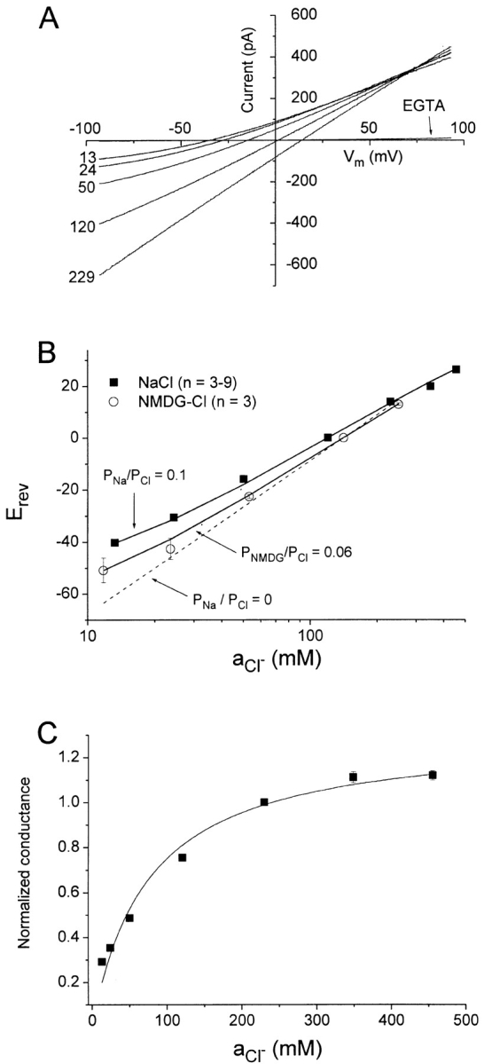 Figure 1. Sodium permeability and Cl affinity of ICl.Ca. An inside-out excised patch from a Xenopus oocyte was exposed to different cytoplasmic [NaCl] concentrations and the I–V relationship determined by 250-ms duration voltage ramp from −100 to +100 mV. (A) I–V curves. The external (pipet) solution contained 150 mM NaCl, 10 mM HEPES, 0.1 mM CaCl2, pH 7.2. The cytoplasmic (bath) solution contained the same solution except that the NaCl concentration was varied. The osmolarity of each solution was adjusted to 665 mOsM by addition of sucrose, except for the 350- and 460-mM solutions, which had higher osmolarities and contained no sucrose. The Cl activities (aCl) measured by Cl-sensitive electrodes are indicated at the left end of each I–V curve. The I–V curve labeled EGTA was obtained in symmetrical 150-mM NaCl solutions, except that Ca2+ in the cytoplasmic solution was omitted and 10 mM Na2EGTA, pH 7.2, was added. (B) Change in Erev as a function of aCl. The reversal potentials from experiments shown in A were corrected for liquid junction potentials. (Solid squares) NaCl solutions. Each data point is the mean of three to nine patches. The heavy solid line is calculated from the Goldman-Hodgkin-Katz equation (ΔErev = 25.7 · ln[(Nao +Cli · PCl/PNa)/(Nai + Clo · PCl/PNa)]) with PNa/PCl = 0.1. (Open squares) NMDG-Cl solutions; n = 3. Thin line is calculated from the Goldman-Hodgkin-Katz equation with PNMDG/PCl = 0.06. The dashed line is calculated assuming that the channel is selectively permeable only to Cl. (C) Affinity of the channel for Cl. The chord conductance was measured from I–V curves between Erev and Erev − 50 mV and plotted versus aCl. The line is a fit to the equation G = Gmax · aCl / Kd + aCl, with an apparent Kd for Cl of 73 mM. |