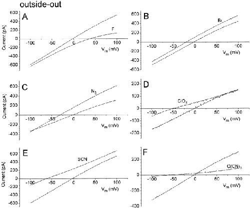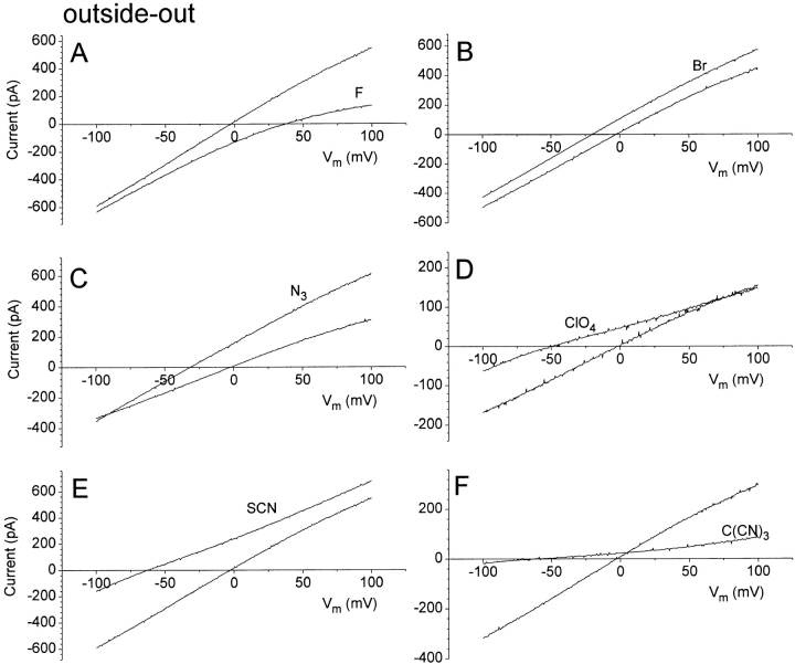 Figure 4. I–V relationships of ICl.Ca in outside-out patches with different external anions. The conditions were the same as Fig. 2, except that the patch was outside-out. (A) Fluoride; (B) bromide; (C) azide; (D) perchlorate; (E) thiocyanate; and (F) tricyanomethanide. |