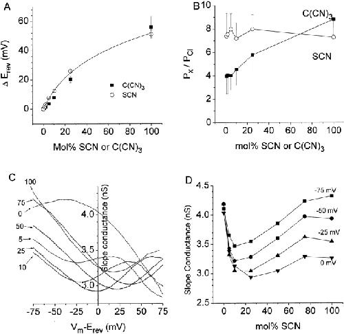 Figure 9. Anomalous mole fraction behavior of ClCaCs. (A) Dependence of Erev on mol% C(CN)3 or SCN. The Erevs corrected for liquid junction potential obtained from experiments such as those in Fig. 7 and Fig. 8 were plotted versus mol% of the substitute anion. (Open symbols) SCN, n = 5; (closed symbols) C(CN)3, n = 4. (Solid line) Goldman-Hodgkin-Katz equation with PSCN/PCl = 8. (B) Dependence of permeability ratio on mol% of SCN or C(CN)3. Px/PCl was calculated from the data in A from the form of the Goldman-Hodgkin-Katz equation: Px/PCl = [Clo · (exp (F/RT · ÎErev) â 1) / Xi] +1, where Clo = 150 mM and Xi is the concentration of the substitute anion. (C) Dependence of slope conductance on driving force at different mol% SCN. The slope conductance was determined by calculating the slope of the IâV curve of an inside-out patch like the one in Fig. 8 using a 20-mV moving window. The resulting curves were smoothed by the FFT smoothing algorithm in Origin and the slope conductance was plotted versus the driving force for different mol% SCN (labels to left of curves). (D) Slope conductance versus mol% SCN. The slope conductance for four different voltages in C was plotted versus mol% SCN. The curves show a minimum slope conductance at 10â25 mol% SCN. |