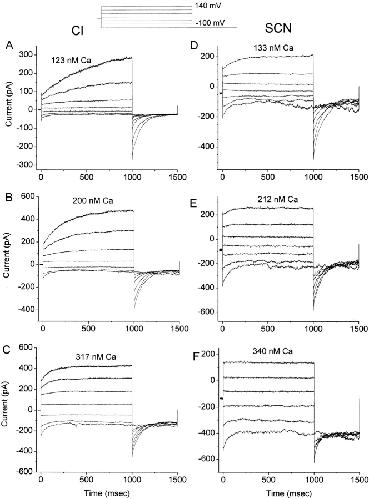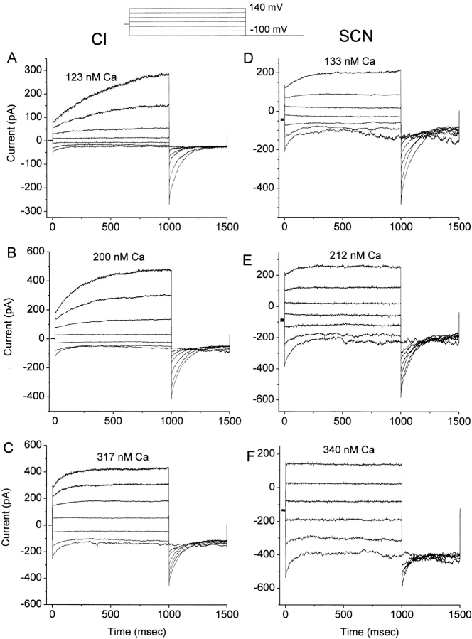 Figure 10. Current traces of ICl.Ca in low free [Ca2+] with Cl or SCN as permeant anion. All traces are from the same patch. Inside-out excised patches were voltage-clamped in symmetrical 150 mM NaCl (AâC) or with 150 mM NaSCN on the cytoplasmic side and 150 mM NaCl on the external side (DâF). The solutions also contained 10 mM TES, pH 7.2, and 10 mM EGTA plus Ca-EGTA, as described in materials and methods, to adjust the free [Ca2+] to the concentrations indicated on the cytoplasmic side. Ca2+ concentrations were measured by Fura-2 fluorescence. The patches were clamped from a holding potential of 0 mV to potentials between +140 and â100 mV for 1 s, followed by a 500-ms pulse to â100 mV. These traces are typical of four experiments. |