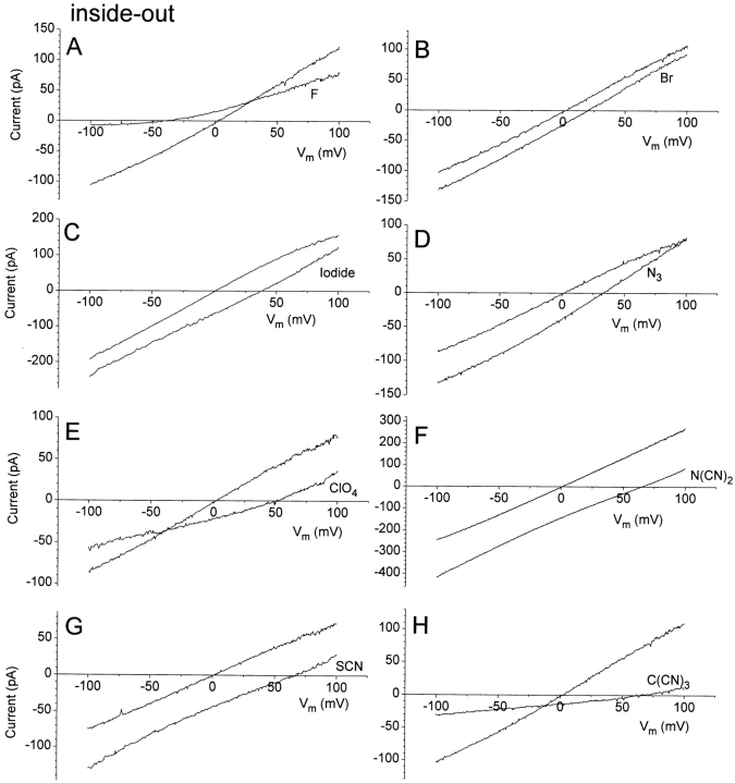 Figure 2. I–V relationships of ICl.Ca in inside-out patches with different cytoplasmic anions. The external solution contained 150 mM NaCl, 10 mM TES, pH 7.2, and 0.1 mM CaCl2. The cytoplasmic solution was shifted between this solution (unlabeled traces) and 150 mM NaX, 10 mM TES, pH 7.2, 0.1 mM CaCl2, where X is the substitute anion (labeled traces). The traces have not been corrected for liquid junction potentials. (A) Fluoride; (B) bromide; (C) iodide; (D) azide; (E) perchlorate; (F) dicyanamide; (G) thiocyanate; and (H) tricyanomethanide (potassium salt). The I–V curves were obtained by voltage ramps from −100 to +100 mV. |