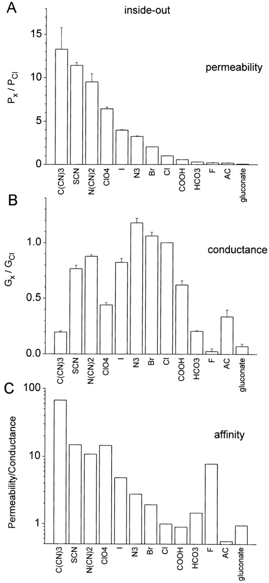 Figure 5. Comparison of permeabilities and conductances. (A) Relative permeabilities. (B) Relative conductances. (Open bars) Inside-out patches with changes in cytoplasmic solution (n = 3–5). (Cross-hatched bars) Outside-out patches with changes in external solution (n = 3–4). (Closed bars) Inside-out patches with substitute anion on both sides of the membrane was compared with Cl on the cytoplasmic side (n = 3–6). (C) Comparison of Px/PCl in different anion channels. ClCaC (open bars; data from this paper); GABAA receptor (cross-hatched bars; data from Bormann et al. 1987); CFTR (slant-hatched bars; data from Linsdell and Hanrahan 1998); and ClC-1 (closed bar; data from Rychkov et al. 1998). |