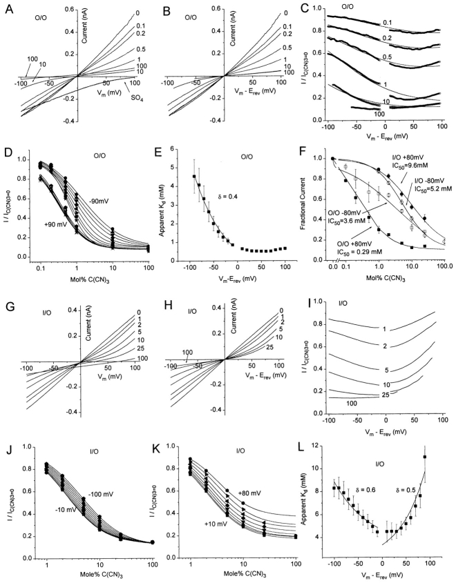 Figure 7. ICl.Ca block by C(CN)3. (A–E) Outside-out patch with C(CN)3 on the extracellular face. (G–L) Inside-out patch with C(CN)3 on the cytoplasmic side. The bath solutions contained 10 mM TES, pH 7.2, 0.1 mM CaCl2, and 150-mM mixtures of NaCl and KC(CN)3. The pipet contained the same solution with 150 mM NaCl. The patch was voltage-clamped with a 250-ms duration voltage ramp from −100 to +100 mV. (A) I–V relationships in outside-out patches with the following external mol% C(CN)3 (the balance being Cl) as marked: 0, 0.1, 0.2, 0.5, 1, 10, and 100. The line marked “SO4” is the I–V curve obtained with Cl replaced with SO4 on the external side to evaluate leak. (B) The I–V curves in A were replotted versus the driving force (Vm− Erev) for each anion mixture. (C) Voltage-dependent block of ICl.Ca by C(CN)3. (Heavy lines) Each curve in B was divided by the curve obtained in 100 mol% Cl. (Light lines) Fit of the data to (see text). (D) Concentration- and voltage-dependent block of ICl.Ca. The data in C were replotted for various potentials as a function of mol% C(CN)3. The data were fitted to the logistic equation: I/IC(CN)3 = 0 = Imin + {(Imax – Imin) / 1 +([C(CN)3] /Kd)n} (solid lines). (E) Apparent Kd of extracellular C(CN)3 as a function of voltage. The apparent Kd at each voltage was determined from the fits in D in four separate experiments and averaged. (F) Inhibition of the current in both inside-out and outside-out patches as a function of mol% C(CN)3. The current was measured at +80 and −80 mV of driving force. The current relative to that in 100% Cl was plotted versus [C(CN)3]. (Squares) Outside-out patches; (circles) inside-out patches; (open symbols) −80 mV; and (closed symbols) +80 mV. (G) I–V relationships for inside-out patches with the following cytoplasmic mol% C(CN)3 (the balance being Cl) as marked: 0, 1, 2, 5, 10, 25, and 100. (H) The I–V curves in G were replotted versus the driving force (Vm− Erev) for each anion mixture. (I) Voltage-dependent block of ICl.Ca by C(CN)3. Each curve in H was divided by the curve obtained in 100 mol% Cl. (J and K) Concentration- and voltage-dependent block of ICl.Ca. The data in I were replotted for various potentials as a function of mol% C(CN)3. The data were fitted to the logistic equation (solid lines). (L) Apparent Kd of cytoplasmic C(CN)3 as a function of voltage. The apparent Kd at each voltage was determined from the fits in J and K for four separate experiments and averaged. |