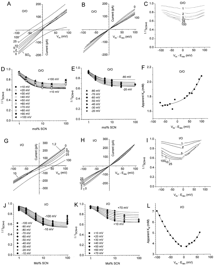 Figure 8. ICl.Ca block by SCN. (AâF) Outside-out patch with SCN on the extracellular face. (GâL) Inside-out patch with SCN on the cytoplasmic side. Bath solutions contained 10 mM TES pH 7.2, 0.1 mM CaCl2, and 150-mM mixtures of NaCl and NaSCN. The pipet contained the same solution with 150 mM NaCl. The patch was voltage-clamped with a 250-ms duration voltage ramp from â100 to +100 mV. (A) IâV relationships with the following external mol% SCN (the balance being Cl) as marked: 0, 1, 2, 5, 10, 25, and 100. (B) The IâV curves in A were replotted versus the driving force (Vmâ Erev) for each anion mixture. (C) Voltage-dependent block of ICl.Ca by external SCN. Each curve in B was divided by the curve obtained in 100 mol% Cl. (D and E) Concentration- and voltage-dependent block of ICl.Ca. The data in C were replotted for various potentials as a function of mol% SCN. The data were fitted to the logistic equation (solid lines). In D, the data points at 100 mol% SCN were ignored in fitting the curves. This experiment is representative of three experiments. (F) Apparent Kd of extracellular SCN as a function of voltage. The apparent Kd at each voltage was determined from the fits in D and E. (G) IâV relationships with the following cytoplasmic mol% SCN (the balance being Cl) as marked: 0, 1, 2, 5, 10, 25, and 100. (H) The IâV curves in G were replotted versus the driving force (Vmâ Erev) for each anion mixture. (I) Voltage-dependent block of ICl.Ca by cytoplasmic SCN. Each curve in H was divided by the curve obtained in 100 mol% Cl. (J and K) Concentration- and voltage-dependent block of ICl.Ca. The data in I were replotted for various potentials as a function of mol% SCN. The data were fitted to the logistic equation (solid lines). In J, the data points at 100 mol% SCN were ignored in fitting the curves. This experiment is representative of five experiments. (L) Apparent Kd of cytoplasmic SCN as a function of voltage. The apparent Kd at each voltage was determined from the fits in J and K. |