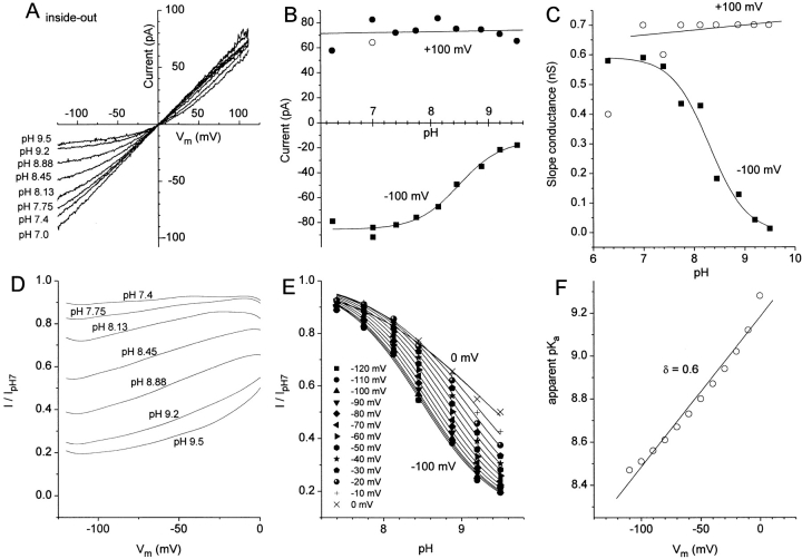 Figure 12. Dependence of ICl.Ca on cytoplasmic pH. An inside-out patch was exposed to bath solutions composed of 150 mM NaCl, 0.1 mM CaCl2, and 10 mM HEPES, adjusted to pH between 6.3 and 9.5 with NaOH. The pipet contained the same solution at pH 7.0. The patch was voltage-clamped by a ramp from −120 to +120 mV. (A) I–V relationship for pH 7.0, 7.4, 7.75, 8.13, 8.45, 8.88, 9.2, and 9.5. (B) Amplitude of the current at +100 mV (circles) and −100 mV (squares) for the traces shown in A and also pH 6.3. (C) Slope conductance measured between −100 and −120 mV (closed squares) or between +100 and +120 mV (open circles). (D) Voltage dependence of pH block. The currents at each pH in A were divided by the current at pH 7.0 and plotted versus membrane potential. (E) pH- and voltage-dependent block of ICl.Ca. The data in D was replotted versus pH. (F) Apparent pKa versus Vm. The apparent pKa of current block was determined from the fits to the data in E and plotted versus membrane potential. This experiment is typical of eight experiments. |