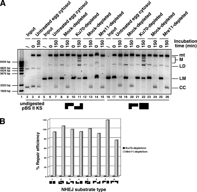 Figure 2. Mre11 is not required for efficient NHEJ. (A) Representative SYBR gold–stained gel characterization of NHEJ products for substrate types nonmatching 3′-PSS (lanes 5–15) and blunt end + 3′-PSS (lanes 16–26). Lanes 5 and 16 show 10 ng of input SacI-KpnI and SacI-SmaI substrates, respectively. The input in lane 2 corresponds to 10 ng of undigested pBS KS II. mt, mitochondrial DNA from X. laevis extract; M, higher multimer forms; LD, linear dimer; LM, linear monomer (substrate); CC, closed circle. (B) The intensity of the bands corresponding to NHEJ products were quantified using the FluorImager system for each NHEJ reaction in Ku70- and Mre11-depleted extracts and were expressed as percent repair efficiency (see Results). The labeling on the x axis refers to the NHEJ substrate type as indicated in Table SI (available at http://www.jcb.org/cgi/content/full/jcb.200506029/DC1).