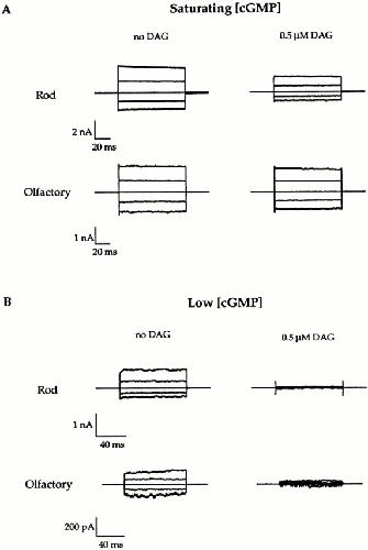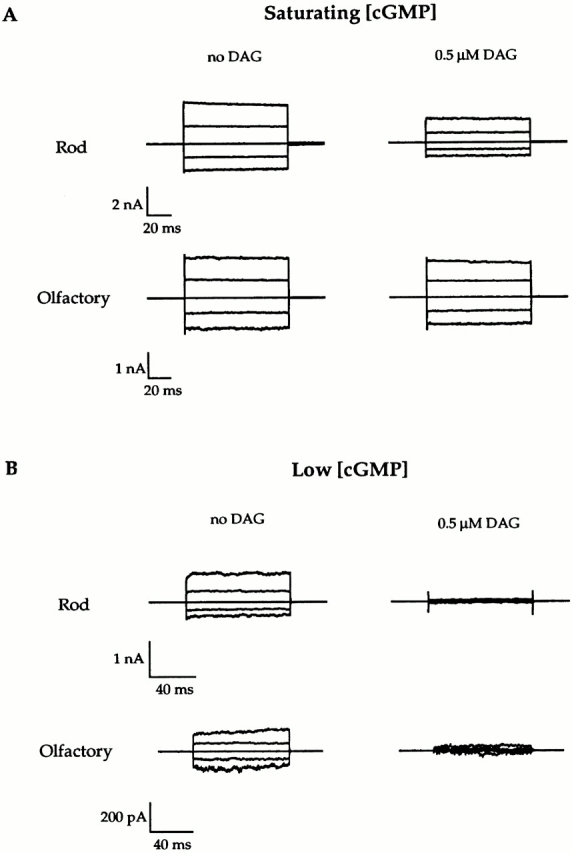 Figure 1. Inhibition by DAG is more pronounced for rod than for olfactory CNG channels. Data were measured from multichannel, inside-out patches of homomultimeric (α only) rod and olfactory channels. The families of cGMP-activated currents were recorded in response to voltage jumps ranging from −100 to +100 mV in steps of 50 mV, from a holding potential of 0 mV. Currents measured in the absence of cGMP were subtracted from all traces. 2 mM cGMP and 100 μM cGMP are saturating levels of cGMP for rod and olfactory channels, respectively. (A) Inhibition at saturating cGMP: rod channels, 42% inhibition; and olfactory channels, 10% inhibition. (B) Inhibition at low cGMP concentrations: rod channels, 10 μM cGMP, I/Imax = 0.2 before DAG application, and 93% inhibition by DAG; olfactory channels, 2 μM cGMP, I/Imax = 0.6 before DAG application, and 72% inhibition by DAG. |