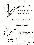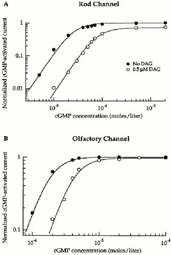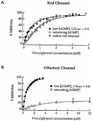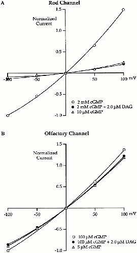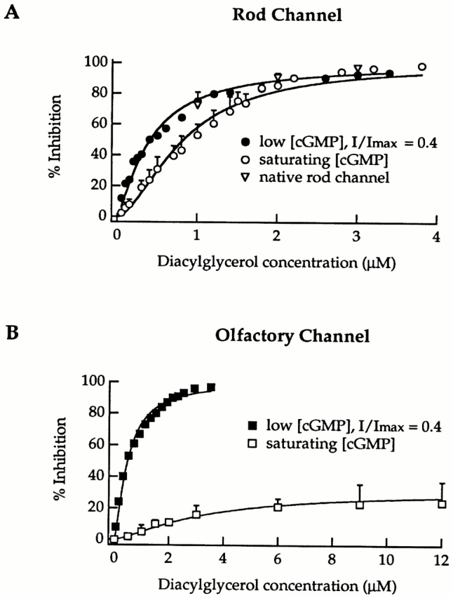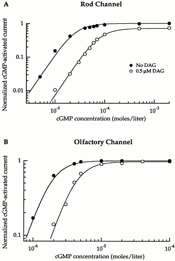 Figure 2. Dose–response curves for rod and olfactory channels demonstrate differential inhibition by DAG. Bath contained low divalent NaCl solution with or without 0.5 μM DAG and various concentrations of cGMP. Steady-state, cGMP-activated currents were measured at +100 mV from a single patch containing either rod or olfactory channels and were normalized to the Imax without DAG. Smooth curves were drawn by fitting the averaged data with the Hill equation, I/Imax = [cGMP]n/(K1/2n + [cGMP]n), where I is the cGMP-activated current, Imax is the cGMP-activated current obtained at saturating cGMP, K1/2 is the concentration of cGMP giving half maximal activation, and n is the Hill coefficient. In fitting the data, this relation was scaled to match the measured maximal I/Imax (e.g., the maximal I/Imax for the rod channel in the presence of 0.5 μM DAG was only 0.71 here, rather than 1). The Hill relation was used only for an empirical description of the data to quantify changes in the apparent affinity and maximal activation (or inhibition; see Fig. 3); it is not meant to suggest a mechanism of channel activation or inhibition by DAG. (A) Rod channels. Top curve (without DAG): I/I max = 1, n = 2.25, and K1/2 = 24 μM. Bottom curve (with DAG): I/I max = 0.71, n = 2.25, and K1/2 = 76 μM. (B) Olfactory channels. Top curve (without DAG); I/I max = 1, n = 2.8, and K1/2 = 1.8 μM. Bottom curve (with DAG): I/I max = 0.97, n = 2.8, and K1/2 = 4.0 μM. |