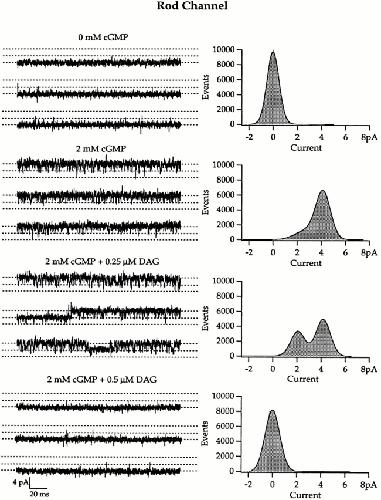 Figure 4. DAG affects Po rather than single-channel conductance of the rod channel. Currents recorded from an inside-out patch containing two α-homomultimeric mutant rod channels. These channels contained two point mutations (H468Q and A483V) that increased their cAMP efficacy to ∼40%. However, like wild-type rod channels, they were very sensitively (IC50 = 0.33 μM DAG) and fully inhibited by DAG even in the presence of saturating cGMP. Holding potential +80 mV, sampling rate 25 kHz after filtering at 5 kHz. Partial records are shown from five traces of 1 s duration. Patches were bathed in low divalent NaCl without cGMP, with saturating cGMP, and with two different DAG concentrations at saturating cGMP as designated. Amplitude histograms from full records (5 s) are shown to the right of each set of current traces. The histograms in the two middle panels were fit by the sum of two Gaussians, with means of 2.1 and 4.2 pA, suggesting a single-channel amplitude of 2.1 pA, with and without 0.25 μM DAG. The smooth lines represent the Gaussian fits, and the shaded areas indicate the histograms that were constructed from the data. |
